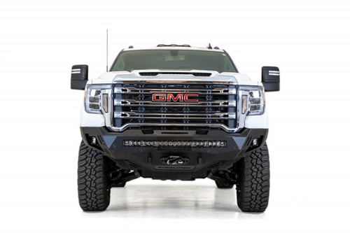 Addictive Desert Designs has done it again! Stealth Fighter Bumpers are now available for all GMC 2500/3500 models. With precision engineering, our radius steel plate design contours perfectly to the front end of your truck. A universal light mount, centered on the bumper, provides space for up to 10 cube lights or a 40 in. radius light bar. Standard cutouts allow OEM parking sensors to be fully-retained and side panels come with an additional cube light. For added strength, Stealth Fighters bolt directly to the trucks frame with a standard Winch mount. Functionality and durability are maximized with access holes at the top of the bumper. Clevis mounts provide added reinforcement with a mounting point for 3/4 in. D-rings. Always bolt-on, always made in America.