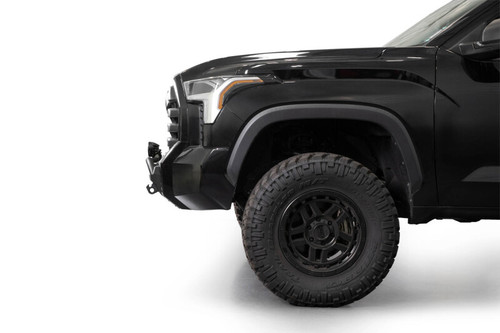 Our Front Bumper features a top hoop with integrated light mounts for running one 20” light bar or two pod lights. The front bumper also provides a center 20” light bar mount. The bumper offers a pair of 1” thick D-ring mounts and an optional Winch Kit for running up to a Warn Evo winch. Our front bumper is made from steel, and is finished in a dual-stage hammer black powder coat with satin black accent panels. It retains the factory parking sensors and fog lights. The bumper can be paired with our removable Aluminum Skid Plate. Made in the USA.