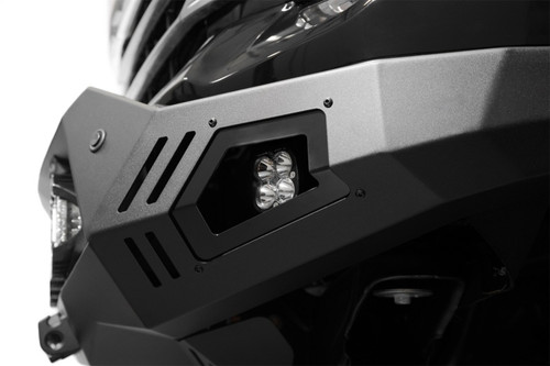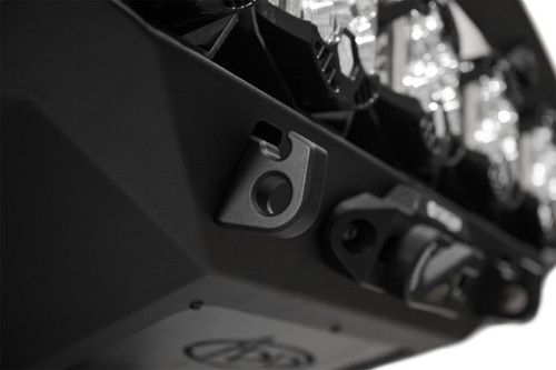 "Our Front Bumper offers off-road utility and an elevated styling. The center cutout fits either five Baja Designs LP6 lights or six RIGID Industries 360 Series 6 in. round lights, or two radiused 40-inch light bars. Additional lighting options are provided by 3-inch cube light mounts in the wings. The bumper features a winch mount and two 1-inch thick D-ring mounts. It retains the OEM parking sensors and adaptive cruise control. The bumper is constructed from steel and finished in a 2-stage hammer black powder coat. It is fully bolt-on and made in the USA.