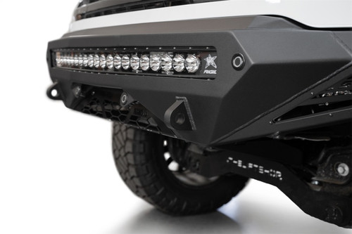 Our Stealth Fighter F-150 Front Bumper features a radial design that accentuates your rig's exterior styling. You can utilize the integrated mounts to run a combination of lights to enhance visibility in low-light conditions. The center mount is compatible with either a 40-inch radius light bar or ten cube lights, and the side panel mounts can fit a 10-inch single row light bar or one cube light. The reinforced clevis mounts for soft shackles provide recovery options when caught in those occasional sticky situations. The optional High Flow Performance Intercooler Kit increases air flow to prevent heat soak, improving your truck's engine performance. For those that work hard and play hard, we recommend our Stealth Fighter Winch Front Bumper for maximum vehicle recovery capabilities. The Stealth Fighter includes sensor cutouts maintaining compatibility with both sensor and non-sensor models. The bumper is constructed from durable American steel, and is finished in a dual-stage hammer black powder coat with satin black accent panels for a sleek look. Its fully bolt-on design allows for a stress-free install process. All ADD products are proudly made in the USA.