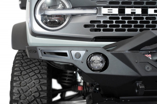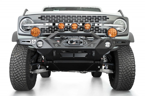 Designed for heavy off-road driving, the Krawler Front Bumper features high clearance angles perfect for rock crawling. Multiple off-road lighting options are available. These include (2) 3 - 4-inch round light mounts in the bumper, (2) light mounts on top of the bumper wings that fit up to 6-inch round lights, and an angular bull bar with (3) light mounts that can fit up to 6-inch round lights. A winch mount sits protected behind the bull bar, and heavily reinforced clevis mounts that take ¾-inch D-ring shackles provide recovery options. Mounts for the OEM parking sensors retain full functionality. An optional 3/16-inch aluminum skid plate is available. The bumper was finished in a hammer black powder coat, and the aluminum accent panels are finished in a satin black powder coat. As always, the Krawler is fully bolt-on and made in America.* Please Note: Our adaptive cruise control relocation bracket is required to retain functionality of the feature on included models. ** Please Note: If using the factory plastic skid, some modification is required for fitment.