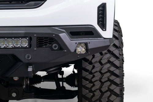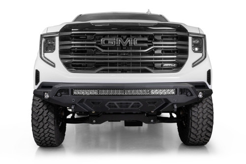 The Stealth Fighter is a winch-capable bumper designed for the 2022-2025 GMC Sierra 1500, excluding diesel, Limited, and AT4X models. Features integrated mounting for one universal 40" radius light bar or up to ten pod lights in the center, plus one pod light mount on each side. Includes two 1" thick CNC-machined D-ring clevis mounts for 3/4" pin D-rings.