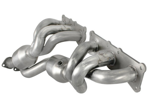 aFe POWER Twisted Steel Long Tube Headers are constructed of near equal length 1-1/2 IN 16-gauge 304 stainless steel tubing with thick flanges to ensure a leak free seal. To eliminate dead space that can cause turbulence and hinder flow that formed collectors are prone to produce, true merge collectors and optimized tube lengths are used for true pulse control technology improving flow and performance. 100% TIG-welded, the smooth curves and increased diameter of this header helps remove restriction and keeps exhaust gas flowing smoothly for improved performance and durability. It uses dual, high flow, 300 CPSI metallic catalytic converters for maximum flow providing an astonishing low end torque improvement. All components are supplied for a hassle-free installation with no modifications necessary. 100% TIG-welded by certified craftsmen for race proven strength and durability. TIG-welding provides the strongest welds reducing stress cracks. The ceramic 300 CPSI metallic catalyst is designed for maximum surface area and flow. aFe has designed this system to retain all your factory sensors for a hassle free installation. Also included are 6 O-ring header flange gaskets. Mitered collectors not only extend the tube lengths and decrease turbulence, but provide optimal exhaust scavenging. The result is increased horsepower, torque and improved throttle response. These headers are constructed of durable CNC mandrel bent brushed 304 stainless steel tubing for maximum performance, corrosion resistance and strength eliminating cracking.