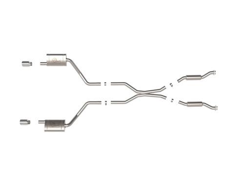 This cat-back exhaust system is constructed of 2-1/2 IN mandrel-bent 304 stainless steel tubing for maximum strength and durability. Finishing off this exhaust system are dual 4-1/2 IN diameter polished 304 stainless steel clamp-on exhaust tips. The tips features a laser etched aFe POWER logo for a unique style. This system features high-flow 409 stainless steel polished mufflers, producing an aggressive sound. Muffler finish may vary. This system produces a deep sound unleashing all available horsepower and torque. Designed to equalize and evenly distribute exhaust pulses reducing drone, improving sound. Utilizing factory style flanges and hangers this system is a direct bolt-on system, which requires no cutting or modifications for a hassle-free installation. A mitered merge x-pipe is used to balance and evenly distribute exhaust pulses traveling through the exhaust system, minimizing exhaust drone and maximizing scavenging. State-of-the-art computer-aided design technology is utilized for precise vehicle fitment. 100% MIG-Welded for race-proven strength and durability.