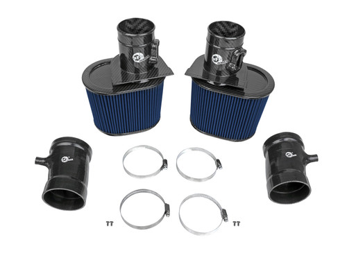 Increase airflow and add more power to your Audi R8 with this Track Series Cold Air Intake system which produced gains of up to +26 horsepower and +17 lbs. x ft. torque as measured on our in-house Dynojet dyno. This system includes massive, dual 6” tall 360-degree radial flow air filters that feature integrated factory mass airflow sensor mounts designed for maximum performance. 100% twill weave carbon fiber bases and tops are strong and lightweight, which complements the look of your R8. Our pre-oiled Pro 5R media with five layers of progressively finer oiled cotton gauze media is our highest flowing filter media, perfect for street and/or track use. Replaces restrictive factory bellows couplers with smooth flowing reinforced silicone couplers. This reduces air turbulence and provides a more aerodynamic flow path to the throttle bodies for more power. This computer designed intake system utilizes the factory airbox and cover and provides all the necessary hardware for a hassle-free installation process that requires no modifications.
