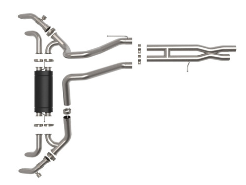 This cat-back exhaust system is constructed of 2-1/2 IN - 3 IN mandrel-bent 304 stainless steel tubing for maximum strength and durability. This system features a high-flow stainless steel muffler, producing a deep sound. This system produces a deep sound unleashing all available horsepower and torque. Utilizing factory style hangers this system is a direct bolt-on system, which requires no cutting or modifications for a hassle-free installation. A mitered merge x-pipe is used to balance and evenly distribute exhaust pulses traveling through the exhaust system, minimizing exhaust drone and maximizing scavenging. This system incorporates factory style pneumatic exhaust valves. The valves direct the flow of exhaust gases and open passageways to bypass the muffler in performance mode. State-of-the-art computer-aided design technology is utilized for precise vehicle fitment. 100% MIG-Welded for race-proven strength and durability.