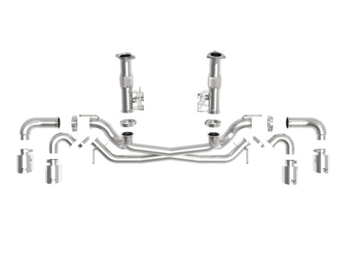 This cat-back exhaust system is constructed of 3 IN to 2-1/2 IN mandrel-bent brushed finished 304 stainless steel tubing for maximum strength and durability. Finishing off this exhaust system are quad 4-1/2 IN diameter polished stainless steel clamp-on exhaust tips. The tips feature a laser etched aFe POWER logo for a unique style. This system produces an aggressive sound unleashing all available horsepower and torque. Utilizing factory style flanges and hangers this system is a direct bolt-on system, which requires no cutting or modifications for a hassle-free installation. This cat-back exhaust system uses a heavy duty flex pipe with an internal interlock liner for added strength and durability. A mitered merge x-pipe is used to balance and evenly distribute exhaust pulses traveling through the exhaust system, minimizing exhaust drone and maximizing scavenging. This cat-back exhaust system incorporates factory style AFM (active fuel management) exhaust valves which use the factory exhaust valve motors (not included). The AFM valves helps to control exhaust pulses during cylinder deactivation. Utilizing state-of-the-art computer-aided design technology, this exhaust system is designed for custom, high tolerance factory fitment. 100% TIG-Welded for race-proven strength and durability.