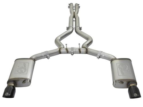 aFe is proud to introduce an all new Mach Force-Xp cat-back exhaust system. In testing, this system resulted in gains up to +11 HP and +14 lbs. x ft. of torque verified by our in house dyno (V8 Engine). This cat-back exhaust system utilizes full 3" tubing with reduction tubes to fit the OE connections. Remove them and combine with the aFe power Twisted Steel Long tube headers and connection pipes (P/N: 48-33012-YC) for added flow and performance. This system incorporates dual, high-flow mufflers to improve performance across the power band while maintaining an aggressive sound. aFe also added an X-pipe to balance and evenly distribute exhaust pulses traveling through the exhaust system, creating more efficient flow and better performance while minimizing exhaust drone resulting in an awesome sound. To finish off the exhaust, dual 4" high-luster polished 304 stainless steel tips are included. This is a direct bolt-on system no modifications necessary and includes all necessary hardware for a hassle-free installation. Aggressive Sound: Dual free-flowing mufflers are used to absorb high pitch tones producing a powerful sound and unleashing all available horsepower and torque. X-Pipe Balance Tube: The equalizer balance tube evenly distributes exhaust pulses traveling through the exhaust system. This creates a more efficient flow for better performance while minimizing exhaust drone. Simple Installation: This is a direct bolt-on system which retains your factory exhaust tips and includes all necessary hardware for a hassle-free installation. No modifications necessary. Leak-Free Seal: High quality band clamps are used for a complete 360 degree sealing surface. Dual 304 SS Tips: Finishing off this unique exhaust system are dual, aFe laser etched, 4" gloss black 304 stainless steel tips for an aggressive style. Removable Reduction Pipes: They can be removed to combine with the aFe Twisted Steel long tube headers for increased flow and performance (P/N: 48-33012-YC).