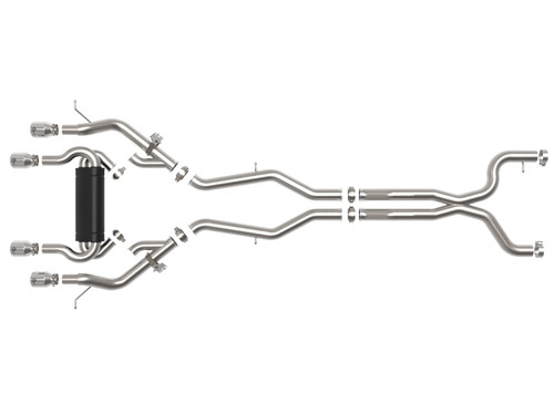 This cat-back exhaust system is constructed of 3 IN - 2-1/2 IN mandrel-bent 304 stainless steel tubing for maximum strength and durability. This system features a high-flow stainless steel muffler, producing an aggressive sound. Muffler finish may vary. Finishing off this exhaust system are quad 4 IN diameter polished 304 stainless steel clamp-on exhaust tips. The tips features a laser etched aFe POWER logo for a unique style. This system produces an aggressive sound unleashing all available horsepower and torque. Some cutting may be required, see instruction sheet for further information. Utilizing factory style hangers this system mounts directly to factory mounting locations for a hassle-free installation. A mitered merge x-pipe is used to balance and evenly distribute exhaust pulses traveling through the exhaust system, minimizing exhaust drone and maximizing scavenging. This system incorporates factory style exhaust valves which use the factory exhaust valve motors (not included). The valves help regulate, direct and control the flow of exhaust gases by opening, closing, or partially obstructing passageways depending on throttle position for maximum performance. State-of-the-art computer-aided design technology is utilized for precise vehicle fitment. 100% TIG-Welded for race-proven strength and durability.