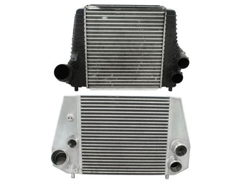 Bladerunner Intercoolers represent the next generation of intercoolers. The Bladerunner intercoolers utilize a 3 in. bar and plate design that out performs OE style tube and fin core designs. The end tanks are constructed out of 3/16 in. TIG welded aluminum plate tanks that incorporate three multi-directional vanes that efficiently direct air flow through the entire core for maximum cooling. The Bladerunner intercooler also comes with 4 1/8 in. pre-tapped ports for easy gauge installation as well as other auxiliary input options. Tested at 200psi which is perfect for the high boost applications. In recent testing the Bladerunner intercooler produced a 200 deg. temperature drop and a 100 deg. EGT drop as well as increasing air flow by 30 percent. Dont waste your time and money on modified factory intercooler. Invest in the aFe Bladerunner intercooler. the most sophisticated intercooler design on the planet.