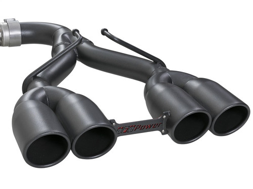 Unique sound and style is what this Rebel Series cat-back exhaust system delivers. 2 1/2" mandrel bent, 304 stainless steel tubing is 100% hand MIG-welded for race proven strength and durability. A high flow stainless steel, muffler delivers a powerful exhaust tone. The system uses factory mounting locations for an easy install that stays put under any driving condition. Finished with rear exit, quad 3 ½" diameter, stainless steel tips with our signature laser-cut aFe POWER badge for a unique, custom-styled look. 2-1/2" mandrel bent, 304 stainless steel tubing is less restrictive than stock. This allows maximum flow and low turbulence for increased torque, horsepower and improved throttle respons e. A primary, free-flowing stainless steel muffler absorbs the high pitch tones and balances exhaust pulses for a powerful exhaust note. Finished with high temp metallic black powder coating for the ultimate in corrosion resistance. Features a custom designed laser cut aFe logo tip brace with a bolt-on red powder coat backing plate to compliment the logo. This system is not compatible with factory receiver (tow hitch).
