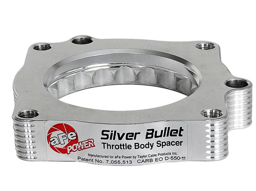 Silver Bullet throttle body spacers create turbulence in the air flow at the point just prior entry into the engine increasing horsepower, torque and improving throttle response and fuel efficiency. Silver Bullet throttle body spacers are constructed out of durable T-6061 billet aluminum and using a unique serrated/helix entry to create turbulence at the manifold while eliminating the annoying whistle found in other helix only throttle spacers.