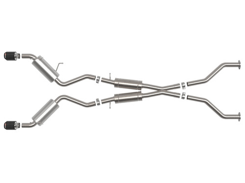 This cat-back exhaust system is constructed of 2-1/2 IN mandrel-bent brushed finished 304 stainless steel tubing for maximum strength and durability. This system features high-flow 304 stainless steel mufflers, producing a deep sound. The mufflers has a polished finish for ultimate corrosion resistance. Finishing off this exhaust system are dual 4-1/2 IN diameter carbon fiber 304 stainless steel clamp-on exhaust tips. The tips features an aFe POWER logo for a unique style. This system produces a deep sound unleashing all available horsepower and torque. Utilizing factory style flanges and hangers this system is a direct bolt-on system, which requires no cutting or modifications for a hassle-free installation. A mitered merge x-pipe is used to balance and evenly distribute exhaust pulses traveling through the exhaust system, minimizing exhaust drone and maximizing scavenging. State-of-the-art computer-aided design technology is utilized for precise vehicle fitment. 100% TIG-Welded for race-proven strength and durability.