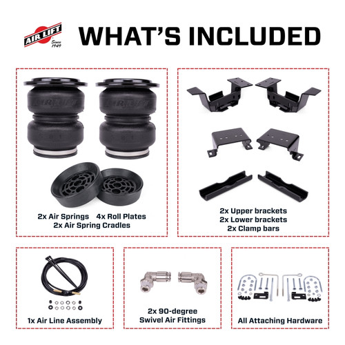 Offering up to 5,000 pounds of load-leveling capacity, the LoadLifter 5000 Ultimate load support kit with Air Spring Cradles from Air Lift makes towing and hauling a comfortable and stress-free experience. Our fully adjustable, industry-leading air springs are the perfect partner for your vehicle. The LoadLifter 5000 Ultimate kit helps to eliminate problems frequently faced when towing and hauling, such as squat, trailer sway, body roll, and bottoming out. With the added stability and weight distribution that air springs provide, you can haul safely with optimal braking and steering control. The kit also includes Air Spring Cradles, allowing the air springs to detach from the lower bracket for full suspension extension, ideal for overlanding and off-roading. As the leader in air suspension products for over 75 years, Air Lift is committed to delivering quality load support parts that last. The key suspension components have all been torture-tested to ensure the highest quality, longevity, and customer satisfaction. With a lifetime warranty and a 60-day ride satisfaction guarantee, you can purchase this kit with peace of mind
