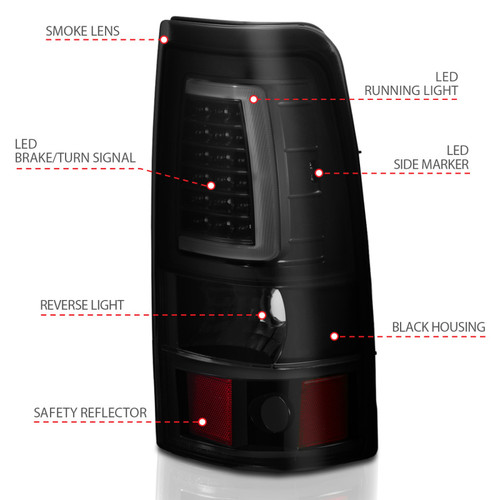 Tail Light Assembly, LED, Smoke Lens, Pair, Plank Style Design. Guaranteed To Improve Your Vehicles Appearance. Rigorously Tested For Fit And Function. Simple Plug And Play. No Modifications Required. Easy Installation Using Common Hand Tools. Uses Stock Mounting Locations And Hardware. D.O.T. Compliant To S.A.E. Standards. Sold As A Pair.