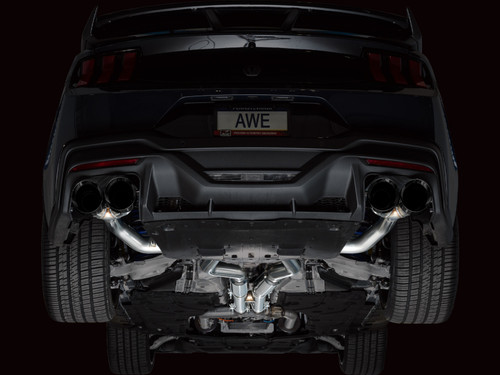 Presenting the AWE Cat Back Exhaust for the Ford S650 Mustang Darkhorse. You’re looking at the Track Edition - the rowdiest version of the lineup. The AWE Track Edition has minimal filter in the rear via dual straight lengths of 3” stainless steel - it’s light, it’s loud (in & out), it’s cost-effective, and it isn’t for the faint of heart–you’ve been warned (and for this reason, the Track Edition can not be returned for sound reasons!). Full 3” & modular, the Track Edition features a full 3” design with modular, slip-fit inlet adapters for perfect mating with the factory headers, while facilitating a dual 3” connection for drivers looking to get spicier up stream one day (or now). And thanks to the precision AWE H-pipe, your 5.0L V8 will produce a deep, rich muscle tone with minimal wrasp (unlike an X-pipe). The Track Edition features straight-through bullet-style resonators in the mid pipes to further defeat wrasp, which becomes especially helpful should you upgrade your headers. When it comes to power to the pavement, we’re looking at dyno-verified gains of +8 hp and +8 lb-ft of torque at the wheels on an otherwise stock vehicle. The full AWE Track Edition is 100% emission-friendly, not interfering with any factory emissions equipment. Bringing up the rear are quad 5” big boys: slash-cut, double-walled, and individually adjustable tips, available in chrome silver or diamond black. Made in PA, USA: engineered, designed, and manufactured in-house at AWE using US-sourced .065”-wall T304L stainless steel. All this plus 50 state emissions compliance, AWE’s Fitment Guarantee, No Check Engine Light Guarantee, and the AWE Lifetime Warranty.