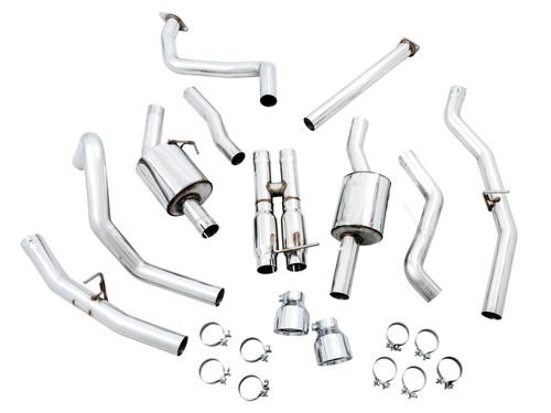 The 0FG is a dual 3” T304L stainless steel Cat Back configuration featuring a bespoke resonated H-pipe and AWE’s patented drone-canceling 180 Technology®. Together, combined with precision fitment, class-leading rigidity, and signature 5” slash-cut tips, you're looking at the Best Sounding Exhaust on the Planet™ for the RAM TRX. American-sourced T304L stainless steel with a wall thickness of .065” runs smoothly from front to back, connecting right after the factory emissions equipment. A resonated H-pipe tailored specifically for the 6.2L-packed TRX is met shortly after to provide an aggressive and rich muscle tone with minimal rasp. You're looking at the Chrome Silver tips version of the exhaust, featuring aggressive 5”, double-walled slash-cut tips, and stamped AWE logos to let everyone know what team you're on. The TRX system by AWE is one of the most significant upgrades available for your TRX. Let's rumble.