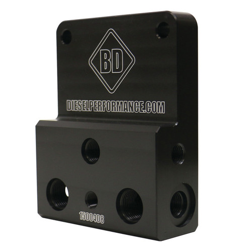 When producing more power from a Dodge RAM 2500/3500 with a Cummins engine, more fuel is required. To supply the injection pump with additional fuel, upgraded lift pumps are added, often with additional filters and water separators to ensure the fuel is always clean. With these upgrades, the factory fuel filter assembly becomes a redundant restriction, or is bypassed completely. The BD Diesel Fuel Bowl Delete kit is designed to remove the factory fuel filter assembly, and allow the addition of a fuel pressure sensor. The kit can also be used as a distribution block for applications using dual CP3 kits. Please note that this kit is intended to be an accessory in addition to an auxiliary lift pump and filter assembly. If the factory CP3 pump feed line has not been upgraded to 1/2-inch hose, an upgraded feed line assembly will be required. See optional accessories for details. WARNING: The use of this kit without auxiliary filters and water separators installed is strongly discouraged. Without a fuel filter in place, the injection system on the diesel engine could become damaged.