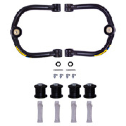 B8 Control Arms are a direct fit upgrade for factory upper control arms on trucks and SUVs. The kit contains a pair of control arms which correct the caster alignment for better straight line stability with lifted suspensions, and the improved pivot angles increase wheel travel and reduce stress on the joints. These strong black powder-coated 4130 chromoly steel arms are a tubular design which allows for more spring and shock clearance and feature greasable polyurethane bushings and heavy duty ball joints for the ideal combination of ride quality and durability with minimal maintenance needed. They come with detailed instructions and all necessary hardware for easy installation and are compatible with all Bilstein shocks and coilover kits. All components are replaceable.