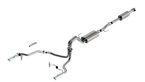 The 3" diameter into dual 2.25" Borla(r) Cat-Back(tm) system was specifically designed to enhance the power and sound of the Ford F-150 equipped with 3.3L engine. The split rear exit configuration replaces the single factory tail pipe, and has single 4" round bright chrome on T-304 stainless steel tips on each tail pipe. A system with black chrome on T-304 stainless steel tips is also available. This system features the aggressive ATAK(r) sound with no drone. Additional systems are available with different options for sound level, tip finish and tip exits. Add adapter 60556 for Crew Cab with Standard Bed (6' 7") 157.2" Wheelbase vehicles. Add adapter 60564 for Extended Cab with Long Bed (8' 2") 164.1" Wheelbase vehicles. Borla(r) Cat-Back(tm) & Axle-Back exhaust systems feature patented straight-through and multi-core technology to unleash hidden horsepower. Increased exhaust velocity adds power, driving excitement, fuel economy, and the distinctive Borla(r) Sound of Power respected by motoring enthusiasts everywhere. Each system is built from premium, high-quality T-304 stainless steel, to give you the absolute best in performance and durability. Ultra-smooth mandrel bends ensure maximum flow & power, and computer numerical control (CNC) manufacturing ensures an accurate fit. All this is backed by our unsurpassed Million Mile Warranty. System Features: Cat-Back(tm) System Split Rear Exit 4" Round Bright Chrome On T-304 Stainless Steel Tips ATAK(r) Sound Level T-304 Stainless Steel Construction Bolt-On Installation Million Mile Warranty