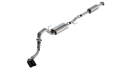 The 3" diameter into dual 2.25" Borla(r) Cat-Back(tm) system was specifically designed to enhance the power and sound of the Ford F-150 equipped with the 5.0L V8 engine. The dual side (passenger side) exit configuration replaces the single factory tail pipe, and has single 4" round black chrome on T-304 stainless steel tips on each tail pipe. Using Borla(r) Stainless Steel Polish p# 21461 is NOT recommended with these black chrome tips. We suggest cleaning the tips with hot water and a microfiber cloth. A system with bright chrome on T-304 stainless steel tips is also available. This system features the mellow Touring sound that gives you a mild sound of power with no drone. Additional systems are available with different options for sound level, tip finish and tip exits. Add adapter 60556 for Crew Cab with Standard Bed (6' 7") 157.2" Wheelbase vehicles. Add adapter 60564 for Extended Cab with Long Bed (8' 2") 164.1" Wheelbase vehicles. Borla(r) Cat-Back(tm) & Axle-Back exhaust systems feature patented straight-through and multi-core technology to unleash hidden horsepower. Increased exhaust velocity adds power, driving excitement, fuel economy, and the distinctive Borla(r) Sound of Power respected by motoring enthusiasts everywhere. Each system is built from premium, high-quality T-304 austenitic stainless steel, superior to T-400 series knockoffs (such as 409), to give you the absolute best in performance and durability. Ultra-smooth mandrel bends ensure maximum flow & power, and precision computer numerical control (CNC) manufacturing ensures an accurate fit. All this is backed by our unsurpassed Million Mile Warranty. System Features: Cat-Back(tm) System Dual Side Exit 4" Round Black Chrome On T-304 Stainless Steel Tips Touring Sound Level T-304 Stainless Steel Construction Bolt-On Installation Million Mile Warranty