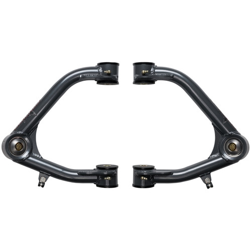 Our Camburg upper arms are designed to address the limitations of stock upper arms when lifting your truck. By replacing the stock ball-joint with a larger 1.25 uni-ball bearing, we improve wheel travel and durability under extreme conditions. We also adjust the caster and camber curve to correct geometry, enhancing driving characteristics and handling. Our arms are meticulously engineered using CAD/CAM software and our in-house CNC machine shop produces all the necessary machined parts. The arms are made from thick .156" wall round tubing, laser cut and CNC bent, and MIG welded in precision fixtures. They are then sandblasted and powder-coated for a durable finish. The arms come with polyurethane frame pivot bushings with grease-able zerk fittings and FK 1.25" PTFE-lined uniballs pre-installed. All necessary hardware is included for installation. The arms are designed for 1-3" of lift and also fit '07-20 Tahoe/Yukon SUVs (without electronic controlled suspension). Please note that some factory wheels may require a wheel spacer and we recommend aftermarket wheels with a zero offset for optimum performance and fit. The factory droop stop must be removed from the frame mount. Our Camburg upper arms are proudly made in the USA and are the best available for your truck.