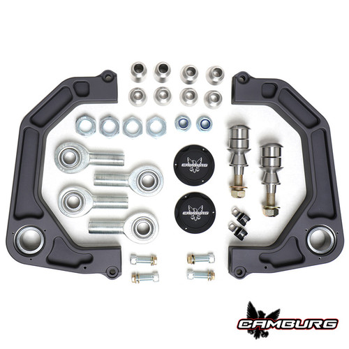 Countless hours were spent designing and refining these arms to the point where they met our high standards. CAD designing and machining gave us the ability to bring some new design elements and features to the table. We CNC machine these from aerospace quality 6061 billet aluminum, then send them out to be bead blasted, Type II anodized gun metal gray and have our Camburg logo laser etched. Like our tubular arms we use a larger FK 1.25” uniball that has a PTFE liner for increased strength and mis-alignment for maximum useable wheel travel. Made in the USA these are far superior to the cheaper and smaller imports other companies use. Adapting the uniball to the spindle/knuckle is done using model specific spacers that match the factory taper precisely. These are machined from heat-treated stainless steel and are a one piece design for increased strength. No drilling or modifications are needed. The 1.25” uniball gives us the ability to run a larger bolt with a low profile press-on uniball cap to resist the elements. Using larger and stronger FK 7/8” chromoly heim joints allows for additional camber and caster adjustment if needed. Using a heim joint also eliminates flexing/deflection under hard use and braking with zero binding when in use. Using AN/Mil-spec hardware we have a single pinch bolt and secondary jam nut to insure the heim is secure with the rigors of off-road use. These heims are considerably stronger than the smaller and cheaper versions many competitors use.