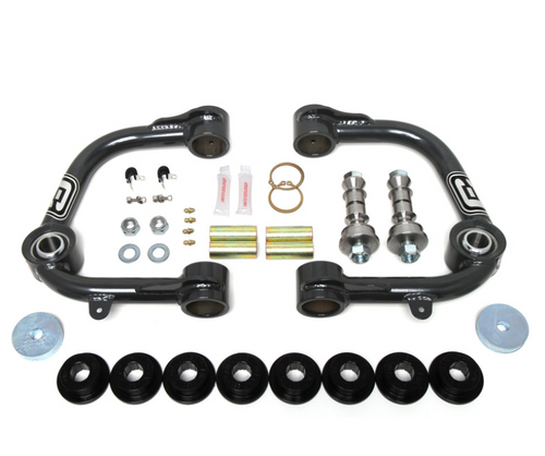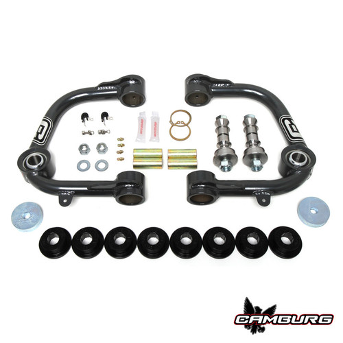 When lifting your truck, the stock upper arms become the limiting factor and hold back your suspensions performance. Our Camburg upper control arms address these issues and more. Replacing the stock ball-joint with a larger 1.00 uni-ball bearing we’re able to gain wheel travel with a part that is considerably stronger and will last longer under extreme conditions. We build more caster and change the camber curve to correct geometry so the vehicle aligns correctly and improves driving characteristics and handling. Using the latest CAD/CAM engineering software we design these arms to the strictest standards using our FARO laser scan arm to model the OEM parts and frames. Manufactured in-house, we have the tubes CNC laser cut and bent, then are MIG welded in precision fixtures before sending out to be sandblasted and powder-coated. Our in-house CNC machine shop makes all the machined parts including the uniball mis-alignment spacers from heat-treated stainless steel. We pride ourselves in producing the best parts available under our own roof and control. Increases usable wheel travel Corrects camber and caster Eliminates weak factory ball-joints Thicker.156" wall round tubing Laser cut and CNC bent tubes MIG welded CAD/CAM engineered Polyurethane frame pivot bushings with grease-able zerk fittings FK 1.00" PTFE-lined uniballs pre-installed Steel gray powder-coating All necessary hardware included and ready to install Made in the USA Designed for 1-3" of lift. These also fit 2001-2007 Toyota Sequoia's. These also fit 2001-2007 Toyota Sequoia's.