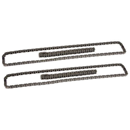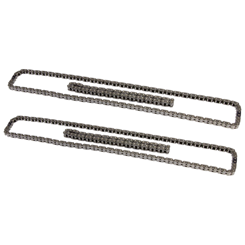 The COMP Cams Hi-Tech Timing Chain Sets for Ford Coyote engines are designed to withstand the stresses of upgraded, modified applications and are the perfect choice when replacing fatigued, worn out factory chains. Any time the cams are being upgraded in a Ford Coyote engine, or it is being built for high RPM racing use, replacing the tired, stock timing chains is a must. The new COMP Cams Hi-Tech Ford Coyote Timing Chain Sets feature heavy-duty secondary chains with 15% thicker plates than the factory chains, which helps to prevent common secondary chain failure. These kits also include premium quality primary chains that are ideal for any high performance or racing application. Whether simply upgrading camshafts or doing a full race engine build, these timing chain sets provide the durability needed in aggressive racing environments. Sets include two primary and two secondary chains.