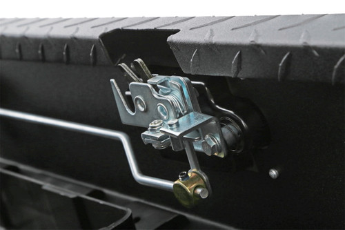 Dee Zee Tool Box - Red Label Double Lid (Gull Wing) Crossover. Constructed of heavy duty Brite-Tread aluminum. Texture black powder coat, provides a matte black finish while it protects and prevents oxidation. Crown style lid for superior rigidity. Other features: lockable powder coated black pull handles, dampened gas shocks, closed cell foam gasket, and self-adjusting strikers. Removable plastic tool tray to help keep small items organized.