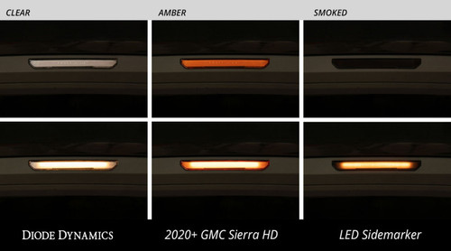 Features Plug-and-play compatible with GMC Sierra HD 2020+ fender lights Dynamic startup sequence with animated effect Fully-illuminated housing, with dual-lens design for an even glow Optional Sequential turn signal feature, with plug-and-play wiring harness OEM-grade construction and perfect fitment Engineered and assembled in USA Overview Upgraded Styling. These LED sidemarkers are a plug-and-play replacement for the factory fender lights, illuminating the entire width of the housing for a distinctive look and brighter appearance. Choose from three lens color options to get the look you're after. Unique Startup. Both the standard and sequential models feature a unique startup sequence. Every time the sidemarkers turn on, they illuminate in an intense amber color starting from the center then spreading to either side. Once they are completely illuminated, they gradually return to a running light mode. Sequencing Turn Signal. Our sequential option provides an upgrade in functionality. Anytime you hit your turn signal, the sidemarkers illuminate in a sequencing amber pattern to indicate signaling! The sequential option uses the included plug-and-play harness to power the fender lights using the headlight connector. Options Amber: These match your original sidemarkers, and are DOT/SAE compliant. Smoked: A dark appearance, great on black and grey vehicles. Clear: These are clear in color, but still have the retroreflector optics.