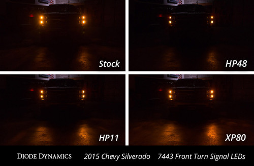 Features Direct replacement for factory incandescent 7440/7443-size turn signal bulb. 48 LEDs in omnidirectional design. Diffusing cover for even output and clean appearance when off. Molded connector with sturdy terminals. Adds more modern LED appearance. Plug and play simple installation. 250 lumens per bulb. Overview Design. Add a modern appearance to your vehicle with the 7440/7443 HP48 turn signal bulb. Populated with 48 Epistar 3014 LED chips the HP48 upgrades the factory yellowish incandescent bulb to a modern LED appearance. Thanks to the cap on the top the light output is directed backward and away from the bulb instead of straight out. A diffused PC lens surrounds the LED chips allowing the light output to shine much more uniformly. Best of all installation only takes minutes - simply take out your factory bulb and the HP48 will fit snugly in the socket. Brightness. At 250 lumens the HP48 is a cosmetic upgrade only and will provide the same light output as your factory bulb. All Diode Dynamics LED lighting is rated with accurate measured lumen figures not calculations or guesses. We test the true output in-house and provide you the real numbers to compare. Reliability. Unlike other bulbs on the market this bulb is built with constant-current circuitry along with transient suppression. That means this bulb will last for years not months with no flickering or failure. And like every Diode Dynamics product it's backed by an industry-leading three-year replacement warranty.