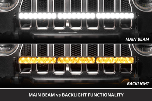 Features Patented TIR Optics for maximum efficiency and output. Upgraded beam patterns engineered for real-world performance. True amber backlight provides unique accent lighting. Durable aluminum housing with ASTM-standard powdercoat finish. Built for the extreme with IP69K waterproof rating. Overview The Bumper LED Lightbar Kit compatible with Jeep JL Wrangler 2018-2026 adds powerful auxiliary lighting with a clean, OEM-style appearance. These application-specific brackets have been CAD-designed to mount a 30-inch LED Light Bar above the front bumper using factory mounting points. No cutting or drilling required! The brackets provide precise, factory-style placement for the light bar while allowing clearance for accessories like a winch. Choose Your Look. Brackets are compatible with any generic 30" LED light bar if you prefer to upgrade or swap bars in the future. Designed for Performance. Each Stage Series Light Bar has been engineered from the ground to provide more output than any other light bar on the market. Unlike reflectors, TIR optics capture and focus nearly all of the light output, shining it only where you need it, without glare or wasted light. Amber Backlight. All Stage Series LED Light Bars include an integrated amber backlight that fully illuminates the TIR optic, providing distinctive accent lighting and enhanced visibility when parked or stopped on the trail. Choose Your Power Level. The Sport model delivers impressive performance and value, while the Pro model provides a noticeable increase in total output and intensity for those who demand the highest level of performance.