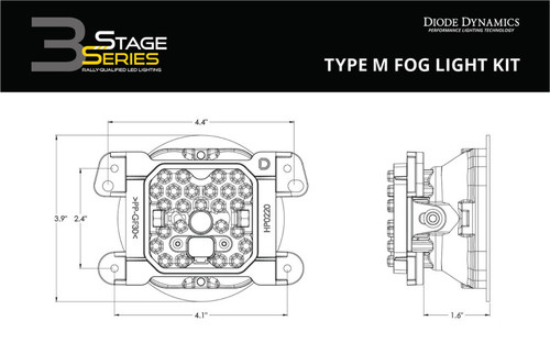 Features Advanced TIR optics provide high efficiency and focus SAE-compliant road-legal output Includes round bezel, for factory-style appearance Plug and play, no modification needed Durable powdercoated aluminum extrusion Engineered and Assembled in USA Overview Overview. Upgrade your fog lights with our SS3 Type M Fog Light Bracket Kit! Featuring higher output intensity than any other 3in light on the market, these LED pods have been designed for maximum functionality, with custom-engineered TIR optics shining in highly useful beam patterns, all in a durable package. With the included round bezel, the SS3 Fog Kit has a clean, factory-style appearance, only much brighter! Plug and Play. Thanks to custom-molded brackets, the SS3 Fog Light Bracket Kit can be installed on your vehicle in minutes. Simply remove your factory fog light assembly and ours will bolt right in its place! Wire adapters are included with the kit, allowing you to connect the lights to your factory bulb sockets - no additional wiring needed! Backlight Functionality. The Stage Series 3in LED Pod is now available with a distinctive backlight, in a brilliant amber color. The SS3's backlight fully illuminates the TIR optic, providing a more unique and modern look than the small indicator LEDs found in other products. SAE Compliant. When installed as a pair and aimed in accordance with your state's regulations the Driving White pattern meets SAE J581 standard as a Driving/Auxiliary High Beam Light and the Fog pattern meets SAE J583 standard as a Foglamp for legal on-road use.