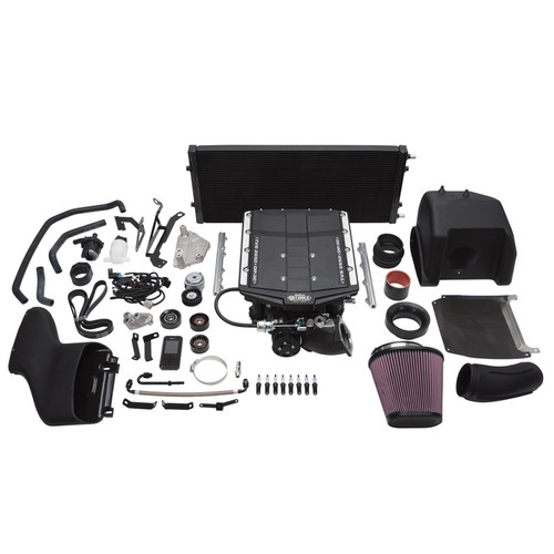 The Edelbrock Supercharger System part #158360 is designed for use on a 2018 Ford F150 with Gen III DI/PI 5.0L Coyote engine and 10-Speed automatic transmission. The heart of this system is the high-efficiency Eaton Gen VI 2650 TVS rotating assembly with a four-lobe design with 170 degrees of twist for maximum flow, minimum temperature rise and quiet operation for excellent drivability. The system also features an integrated bypass valve to help eliminate parasitic loss under light throttle, improving fuel mileage potential. The front drive, front inlet configuration results in a shorter, less restrictive intake path for improved airflow without the need for a power-robbing jackshaft. Keeping the air cool is a high-capacity, Dual-Pass 3-Core (DP3C) air-to-water intercooler and duel pass front-mount heat exchanger. The Edelbrock #158360 system is 50-state emissions legal and provides the best combination of performance and reliability for your F150 whether you plan to tow a trailer, haul heavy loads, or you just want to feel your F-150 come to life! HANDHELD PROGRAMMER NOT INCLUDED. Supercharger systems sold without tuners are only emissions legal when used with the correct Edelbrock program. Which can be requested by contacting the Edelbrock calibration team at calibration@edelbrock.com. Tunes for 91 and 93 octane fuels are available upon request. This system will produce approximately 601whp 468wtq using 93 octane.