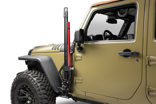Front driver side exterior jack mount for the Jeep Wrangler JK and JKU - Easily mounts high clearance off-road and farm jacks securely to side of your Jeep. The unique design keeps the jack from rattling while driving. Easy bolt-on, no-drill installation. The Jack Mount comes with a Limited Lifetime warranty on materials and construction and a 5 year warranty on the the textured black finish.
