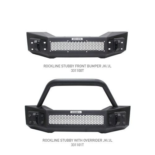 Part of Go Rhino's famous Jeep Bumper family of products. Rockline Winch Ready Front Stubby Bumper for Jeep JK, JL and JT Wrangler with signature hex mesh LED protective cover for use with either an industry standard 20" double row LED bar or up to 4 standard 3" cube lights. Rockline Bumpers come with a Limited Lifetime warranty on materials and construction and a 5 year warranty on the Textured Black finish.