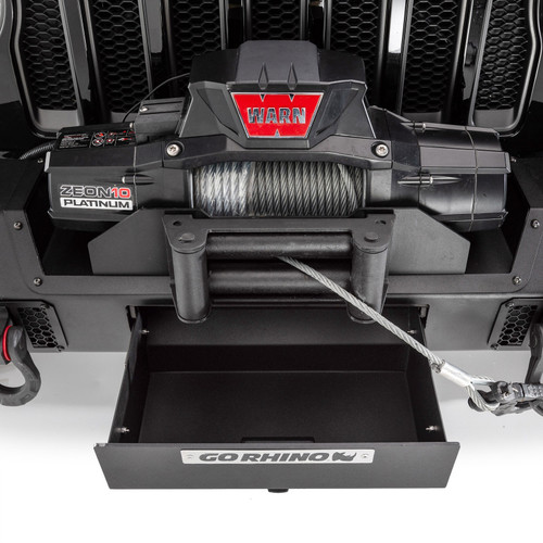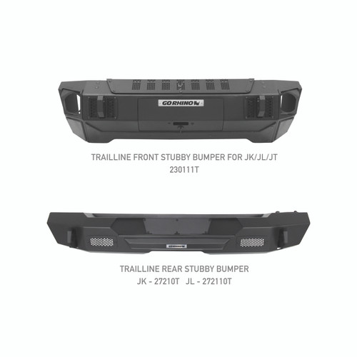 Part of Go Rhino's famous Jeep Bumper family of products. Trailline Winch Ready Front Bumper with stubby style end caps and patented(US D790,408) rhino hook shackles. Bumper has gear drawer with latch. 3 optional light bar mounts also available. Trailline Bumpers come with a Limited Lifetime warranty on materials and construction and a 5 year warranty on the Textured Black Finish.