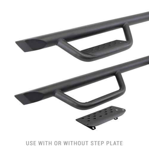 The Go Rhino Dominator Xtreme D2 combines the good looks and cool factor of the drop step design with the functionality of a traditional OE oval side step. The one-piece main bar is constructed of heavy duty steel tubing with the two welded hoops strategically placed beneath each door. The punched steel step pads offer no-slip grip in wet or muddy conditions and make entry and exiting a lifted vehicle easy. Installation is easy and the utilization of the OEM step mount locations means no drilling or cutting required. Hardware and brackets are included. The Xtreme D2 Side Steps come with a Limited Lifetime warranty on materials and construction and a 5 year warranty on the Textured Black Finish.