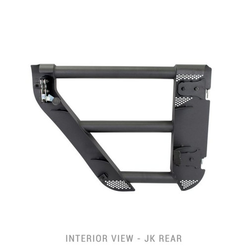 Go Rhino’s Trailline™ Tube Doors remove the final barrier to the total, immersive outdoor experience while offering a stylish alternative to factory doors. Manufactured from 2” steel tubes fully welded onto 16-gage steel plates, these doors are designed for both utility and ease of installation. The easy-grip ball latch handle double-clicks for both easy-close and hard-close. Adjustable rubber plungers balance the door to the frame to eliminate vibration and rattling. The cast steel hinges utilize the factory hinge pin and the factory nuts for easy installation.