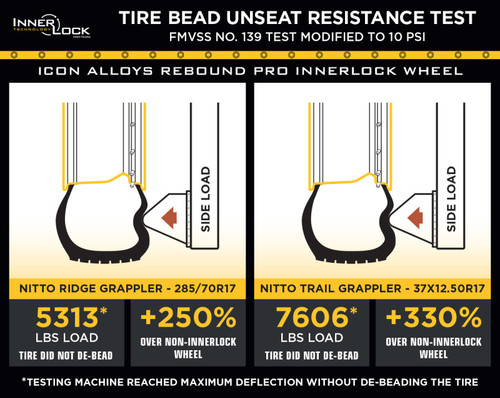 Staying true to the ICON Alloys approach, the Rebound PRO has been engineered to maximize caliper clearance and optimize wheel position for un-hindered suspension travel and steering function. Backspace and wheel offset dimensions have been strategically developed to reduce scrub radius, improving all-around handling and ride quality. The Rebound PRO has also been strength tested to yield a 3,200lb load rating - making it one of the strongest wheel options on the market. With build features such as these, it's clear that a set of ICON Alloys wheels is the perfect complement to any truck, Jeep, or SUV.