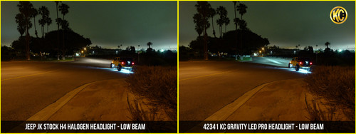 FEATURES-Gravity LED Pro 7" Headlights-Patented Gravity Projector Optics(GPO)-Hard Coated Polycarbonate Lens-Precision Die-Cast Aluminum Housing-DOT Compliant Low and High Beam with built-in Daytime Running Light-KC Engineered Polished Reflector Optics-Plug-n-Play for Jeep JK-***Note: Does not fit 17-18 Jeep JK Rubicon/Sahara editions or Jeeps equipped with factory LED headlightsLIGHT PERFORMANCE(PER LIGHT)-Raw Lumens: Low- 2,967 lm, High- 2,575 lm, DRL- 386 lm-Lux @ 10 Meters: Low- 400 lx, High- 700 lx?-Candela: Low- 40,000 cd, High- 70,000 cd-Beam Distance: Low- 400m, High- 529mSPECIFICATIONS(PER LIGHT)-Wattage: Low- 18W, High- 25W-LED Bulb: CREE: XPL/XPG2-Color Temp: 5000K-Amp Draw: 1.88A-Voltage: 9V-18V-IP Rating: IP68-Product Dimensions: W - 6.96" x D - 5.098"Gravity EXTREME OUTPUT AND EFFICIENCYThe Gravity LED Pro 7" headlight uses KC's patented Gravity Projector Optic (GPO). Utilizing this proprietary projector lens technology along with a GRD LED core, KC engineers were able to deliver a more controlled beam pattern while setting new industry standards in light shape, clarity and output. HIGH-PERFORMANCE REFLECTOR OPTICSThe Gravity LED Pro 7" Headlight features KC's patented Gravity GRD technology, which is engineered to direct every lumen from powerful LEDs into usable light output.HIGH/LOW/DRL FUNCTIONHigh/Low beams as well as DRL functionality come installed in this KC projector headlight to greatly improve visibility and clarity over factory Jeep headlights.DESIGNED FOR DURABILITYThe Gravity LED Pro 7" Headlight uses a durable die-cast housing and Polycarbonate lens, to tolerate the harshest climates and conditions.