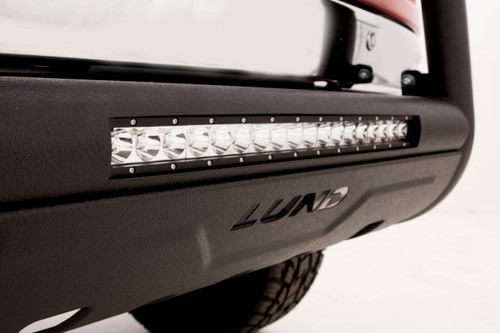Protects your front end from flying debris with 3.5 inches of oval steel tubing. These bull bars also boost your visibility with an integrated 20 in. LED light bar. The included heavy duty light bar illuminates your night driving with a bright flood beam pattern and is easily wired into your factory light wiring, or a wiring harness can be purchased separately. Available in black textured powder coat or polished T304 stainless steel finish. Our popular LUND bull bars may now be ordered with a wire harness kit. The wire harness kit is also sold separately for lighting and accessories up to 30 Amps. LUND's bull bars with LED light bar and wiring kit is the total package to see and be seen, providing complete front end style, lighting and protection.