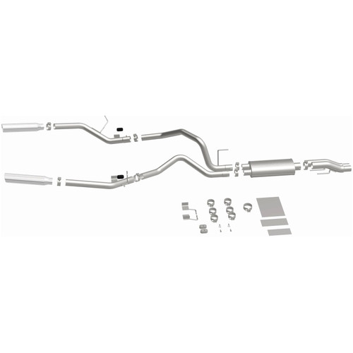The MagnaFlow 2011-2014 Ford F-150 Street Series Cat-Back Performance Exhaust System 15460 brings out the personality of your 3.7L, 5.0L, 6.2L 2011-2014 Ford F-150 with our signature resonant, powerful engine tone and dyno-proven performance. Thanks to its fast-flowing, mandrel bent 3in. main piping and 1 Straight-Through mufflers ending in a Dual Split Rear exit with 3.5in. Polished Clamp-On Single Wall Angle Cut Rolled Edge tips, this Ford F-150 exhaust kit has the performance chops to match its sporty sound and appearance. Upgrade your ride to the next level with an exhaust that has the pipes to put other Ford F-150's to shame. With this system your vehicle will be producing Aggressive exterior and Moderate interior sound levels while leaving other cars and trucks feeling envious at every stoplight. Exhaust kit 15460 features a cat-back layout that replaces your ride's stock exhaust components from near the catalytic converter on back. Extensive 3D scanning during development has resulted in a direct-fit design that you can easily install yourself. 15460 is produced using CNC precision robotic manufacturing techniques and is backed by MagnaFlow's 1-year limited finish warranty and limited lifetime construction warranty.