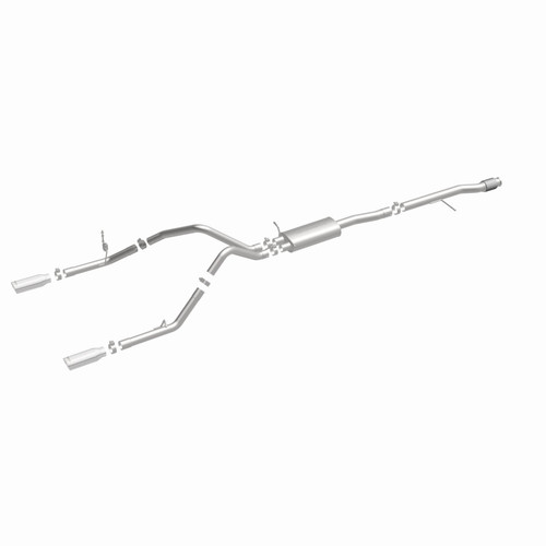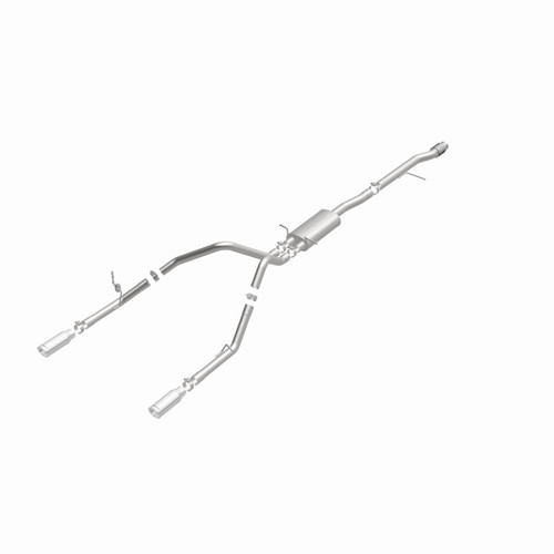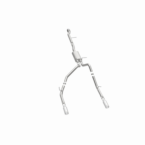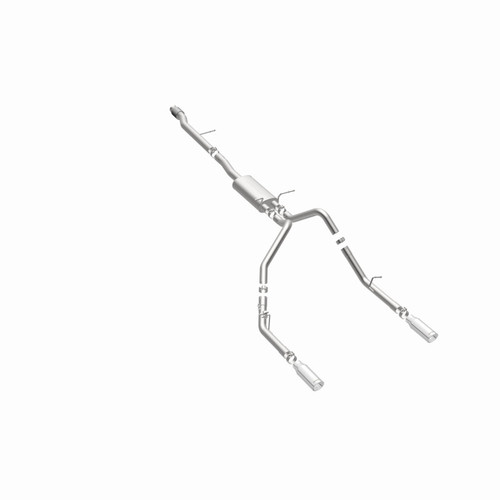 The MagnaFlow Street Series Cat-Back Performance Exhaust System 15268 brings out the personality of your Truck with our signature resonant, powerful engine tone and dyno-proven performance. Thanks to its fast-flowing, mandrel bent 3in. main piping and 1 Straight-Through mufflers ending in a Dual Split Rear exit with 4in. Polished Clamp-On Double Wall Angle Cut Rolled Edge tips, this Truck exhaust kit has the performance chops to match its sporty sound and appearance. Upgrade your ride to the next level with an exhaust that has the pipes to put other Truck's to shame. With this system your vehicle will be producing Aggressive exterior and Moderate interior sound levels while leaving other cars and trucks feeling envious at every stoplight. Exhaust kit 15268 features a cat-back layout that replaces your ride's stock exhaust components from near the catalytic converter on back. Extensive 3D scanning during development has resulted in a direct-fit design that you can easily install yourself. 15268 is produced using CNC precision robotic manufacturing techniques and is backed by MagnaFlow's 1-year limited finish warranty and limited lifetime construction warranty.