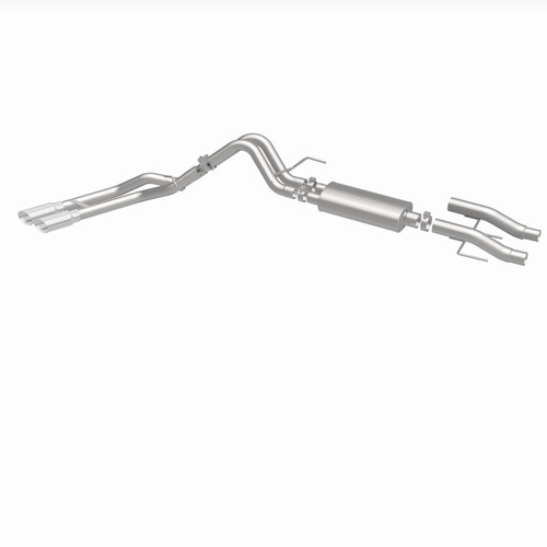 The MagnaFlow Street Series Cat-Back Performance Exhaust System #19565 works with all 2015-2023 and 2021+ engine variants of the Ford F-150. This system brings its aggressive sound to your truck's engine in addition to MagnaFlow's deep signature exhaust tone and dyno proven performance enhancements. It does all this while keeping volume at a reasonable level in the truck's interior. MagnaFlow #19565 features durable 100% stainless steel construction, a single straight-through muffler, 3" mandrel bent tubing and dual passenger-side angled exit after the rear tire with polished 3.5" tips. Cutting-edge CNC precision robotic manufacturing is used to make sure that the exhaust kit's direct-fit layout will bolt on easily for installation.