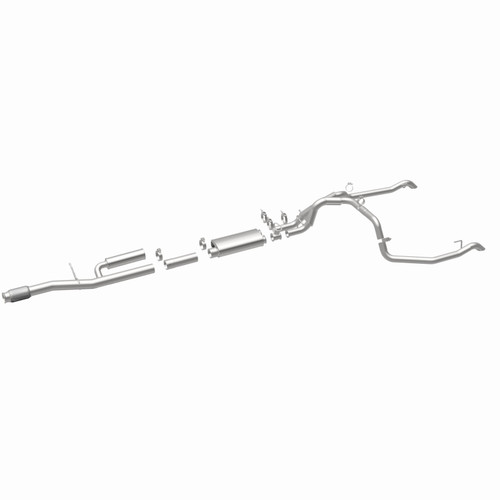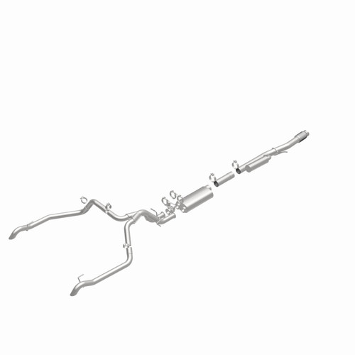 The MagnaFlow Chevrolet Silverado 1500 ZR2 Overland Series Cat-Back Performance Exhaust System #19703 brings all the technology, dyno-proven performance and configurable sound your truck needs to be crowned the ultimate Silverado. This exhaust kit is compatible with every 2024+ Chevrolet Silverado 1500 ZR2 running a 6.2L engine and features an easy-to-install direct-fit design that replaces your truck’s OEM exhaust system from near the catalytic converter on back. #19703 features high clearance tucked 3.5” diameter mandrel bent main piping that passes through an NDT (No Drone Technology) resonator and an 18” oval body performance muffler, effectively mitigating any droning noises that may otherwise occur when cruising at highway speeds. The tucked design also considerably improves both ground clearance and departure angles. This Silverado 1500 ZR2 performance exhaust system terminates in a dual split rear exit and includes integrated, functional active exhaust valves cast in durable 304 stainless steel. Exhaust kit #19703 is secured using racing-bred quick-release V-band clamps. #19703 is made of durable stainless steel and produced using advanced 3D scanning technology and CNC precision robotic manufacturing techniques, all backed by MagnaFlow’s limited lifetime warranty.