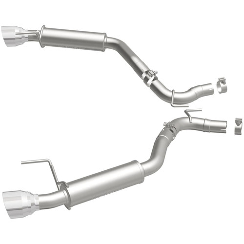 The MagnaFlow 2015-2023 Ford Mustang Competition Series Axle-Back Performance Exhaust System 19179 brings an aggressive, attention-grabbing edge to the deep resonant exhaust note we're so well known for. This exhaust kit is designed to enhance your 2.3L, 3.7L 2015-2023 Ford Mustang with dyno-proven performance made possible thanks to fast-flowing mandrel bent 2.5in. main piping and 2 Straight-Through mufflers ending in a Dual Split Rear exit with 4.5in. Polished Welded-On Double Wall Angle Cut Folded Edge tips featuring a sporty finish. The exhaust system's axle-back layout replaces your ride's exhaust system from near the rear axle on back. Exhaust system 19179 is engineered to make your vehicle's engine produce Aggressive exterior and Moderate interior sound levels, befitting its competition-oriented design. 19179's direct-fit design makes installation a breeze thanks to the use of advanced 3D scanning techniques. This performance exhaust system is made of 100% durable and corrosion-resistant stainless steel and produced using CNC precision robotic manufacturing, all backed by MagnaFlow's limited lifetime warranty. Please check to ensure compliance with local noise regulations.