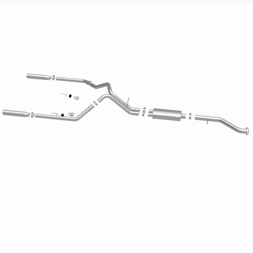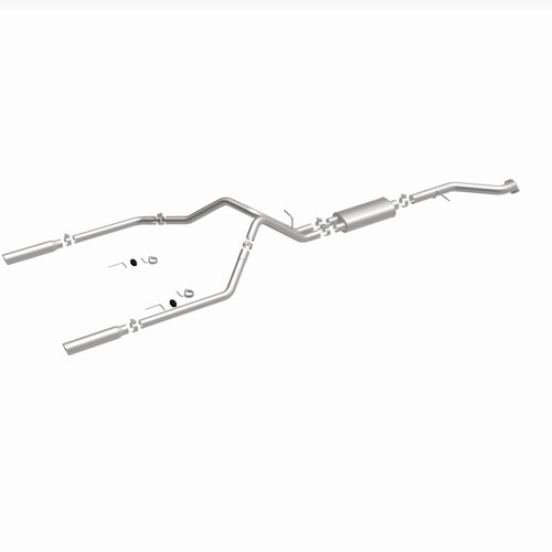 The MagnaFlow Street Series Cat-Back Performance Exhaust System 15753 brings out the personality of your Truck with our signature resonant, powerful engine tone and dyno-proven performance. Thanks to its fast-flowing, mandrel bent 3in. main piping and 1 Straight-Through mufflers ending in a Dual Split Rear exit with 3.5in. Polished Clamp-On Single Wall Angle Cut Rolled Edge tips, this Truck exhaust kit has the performance chops to match its sporty sound and appearance. Upgrade your ride to the next level with an exhaust that has the pipes to put other Truck's to shame. With this system your vehicle will be producing Aggressive exterior and Moderate interior sound levels while leaving other cars and trucks feeling envious at every stoplight. Exhaust kit 15753 features a cat-back layout that replaces your ride's stock exhaust components from near the catalytic converter on back. Extensive 3D scanning during development has resulted in a direct-fit design that you can easily install yourself. 15753 is produced using CNC precision robotic manufacturing techniques and is backed by MagnaFlow's 1-year limited finish warranty and limited lifetime construction warranty.