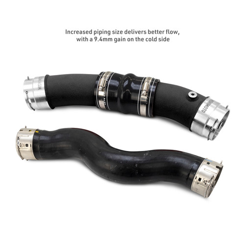 Give your 2024+ Toyota Tacoma the performance edge it needs with the Mishimoto Performance Intercooler Pipe and Boot Kit. The stock setup might get the job done, but when airflow and reliability are on the line, this upgraded system offers a direct-fit solution built for long-lasting performance. Each pipe in this kit is constructed from rugged aluminum and engineered with a streamlined design to deliver improved airflow over factory piping, helping your turbocharged Tacoma breathe easier.--Precision-machined CNC quick-disconnects ensure a seamless fit and hassle-free installation. This kit is fully compatible with both the factory intercooler and the Mishimoto Performance Intercooler, giving you the freedom to upgrade in stages or build your setup all at once. To keep everything sealed under pressure, the kit includes Mishimoto DuraCore™ boots. This high-performance silicone features a synthetic interior layer that offers maximum resistance to heat, pressure, fuel, and oil. Constant-tension worm-gear clamps add another layer of reliability by adapting to temperature changes to maintain a tight seal.--A pre-installed dimpled bung accepts a 1/8" NPT sensor, so you can easily integrate boost or temperature monitoring without modification. To match performance with style, the aluminum piping is available in wrinkle black or red finishes, letting you customize your build without compromising function. Like every product we make, the Mishimoto Intercooler Pipe and Boot Kit for the 2024+ Tacoma is backed by our Lifetime Warranty, ensuring long-term confidence with every drive.